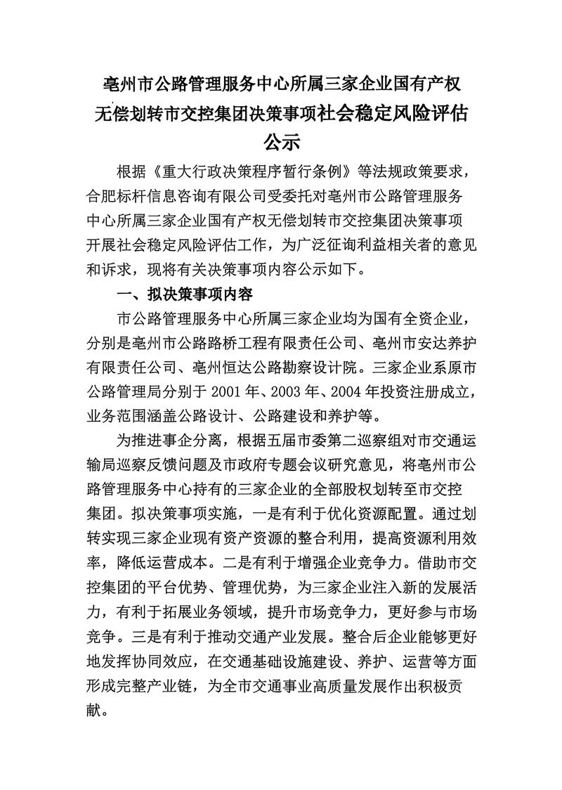 亳州市公路管理服务中心所属三家企业国有产权无偿划转市交控集团决策事项社会稳定风险评估公示
